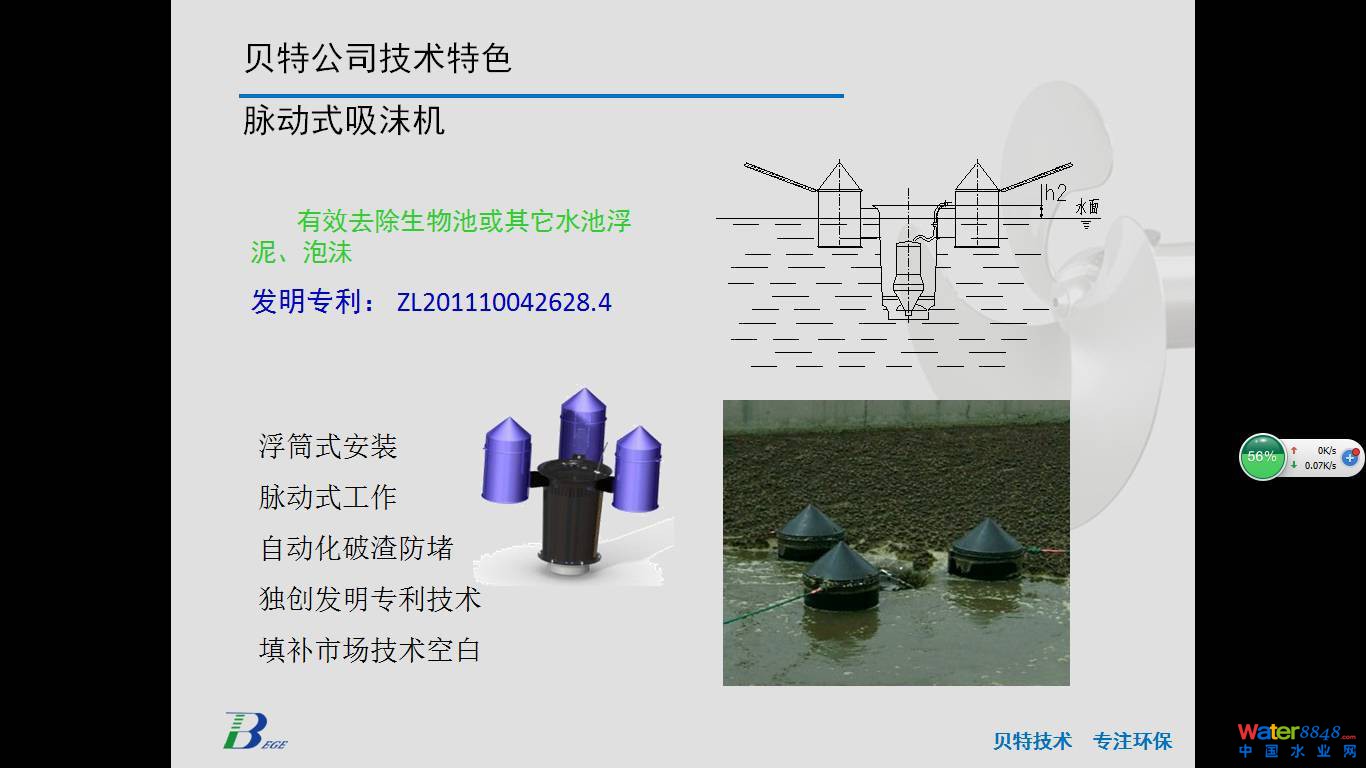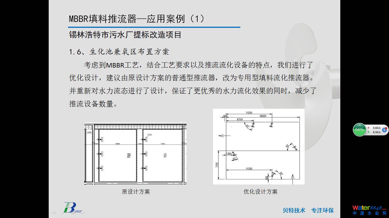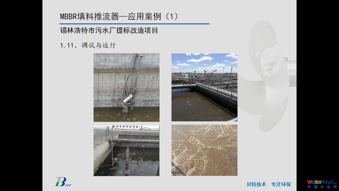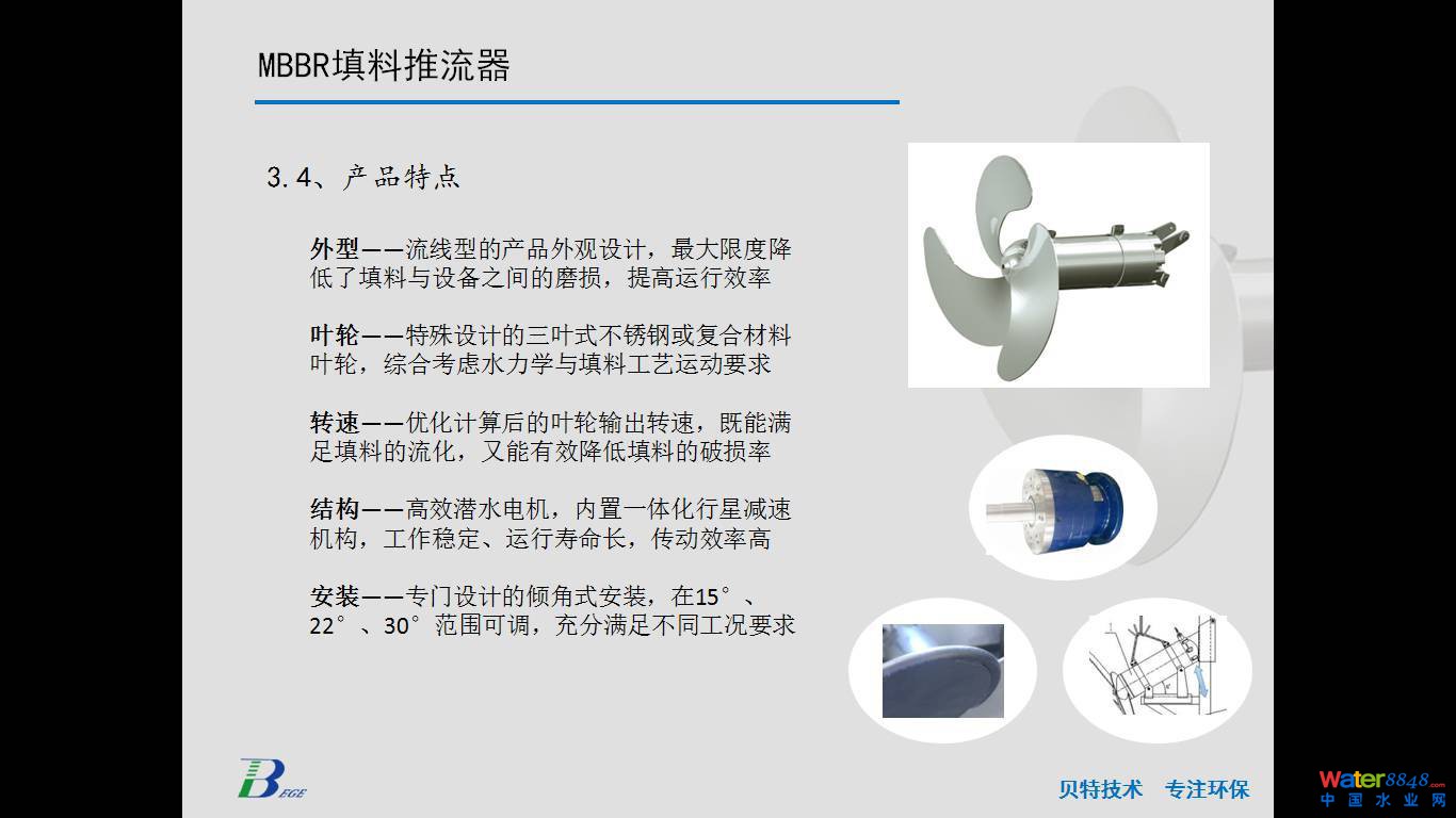 首先感謝會(huì)務(wù)組這么緊湊的安排。前面幾位專業(yè)廠家對(duì)MBBR工藝和懸浮填料做了非常全面深刻的介紹,F(xiàn)在由我來(lái)代表南京貝特給大家?guī)?lái)一款適用于MBBR工藝的設(shè)備,就是前面幾位提到的MBBR比較重要的關(guān)鍵的一個(gè)環(huán)節(jié),即懸浮填料的流化推流。