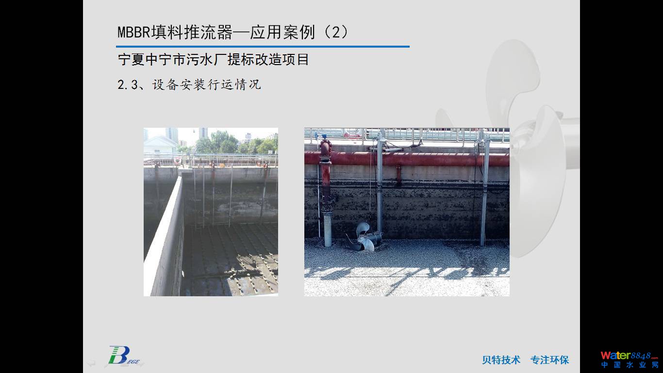 我主要介紹下面這幾個(gè)內(nèi)容,前面先介紹兩個(gè)案例,都是去年下半年投用的,用我們的設(shè)備量相對(duì)多一點(diǎn)。第一個(gè)是錫林浩特污水廠,使用了36臺(tái)我們的填料推流器;第二個(gè)是寧夏中寧污水廠用了32臺(tái)。這兩個(gè)項(xiàng)目到目前都已調(diào)試正式運(yùn)行。錫林浩特污水廠原總處理量是4萬(wàn)噸,這個(gè)污水廠的水質(zhì)特點(diǎn)跟錫林浩特周邊環(huán)境關(guān)系比較密切,屠宰廢水,養(yǎng)殖廢水的毛發(fā)含量比較多,所以當(dāng)時(shí)出水的標(biāo)準(zhǔn)滿足不了要求。改造的時(shí)候使用了MBBR工藝,設(shè)置了厭氧,兼氧和好氧池等工藝環(huán)節(jié)。填料推流器設(shè)置在兼氧和好氧區(qū),這是我們的填料流化專用推流器。