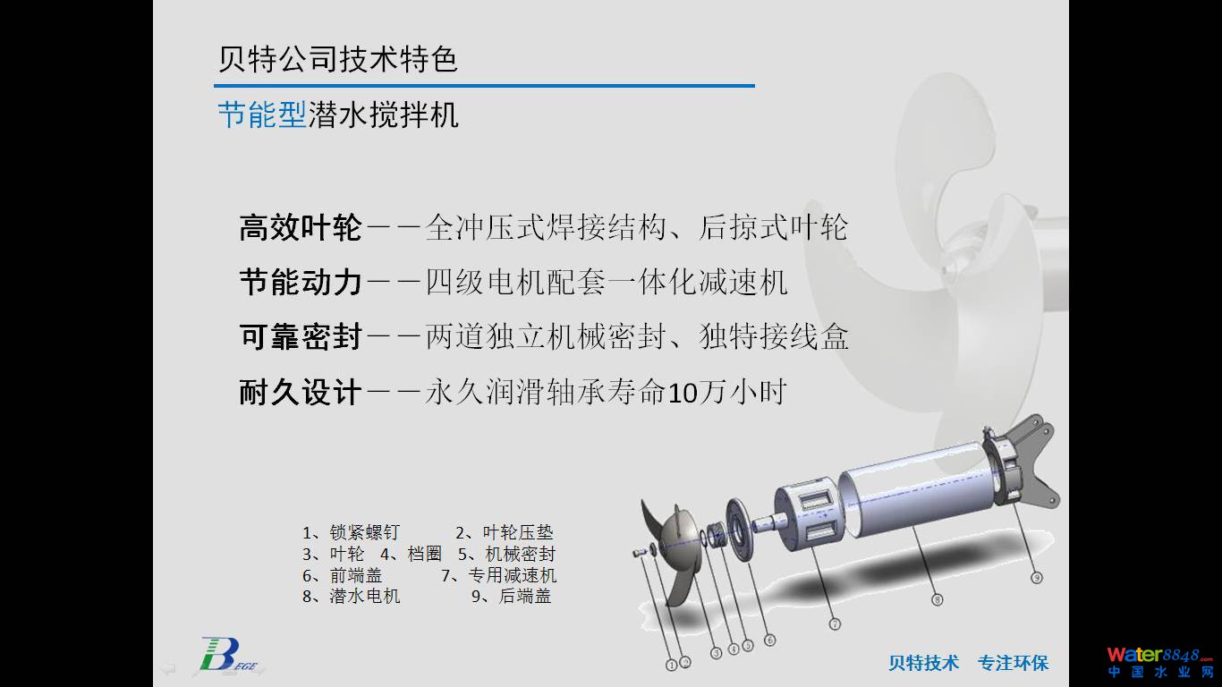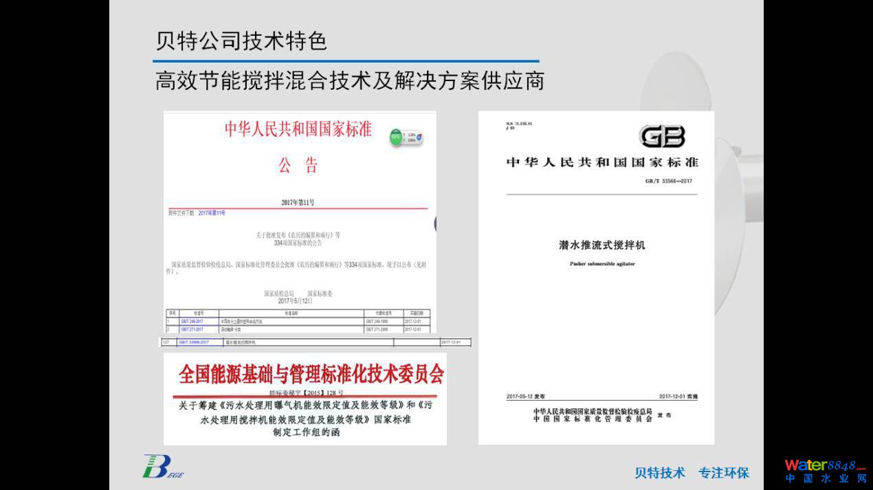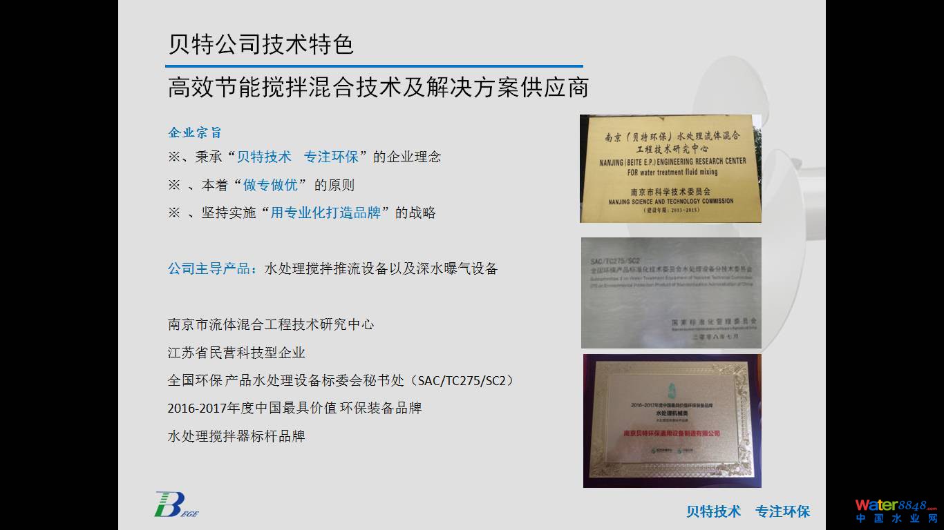 下面我把貝特環(huán)保公司簡(jiǎn)要介紹一下,公司正式注冊(cè)于2003年6月,多年來(lái)一直專注做水處理攪拌類設(shè)備。在這方面我們碰到的問(wèn)題,做的工程案例,包括經(jīng)驗(yàn)總結(jié)非常多。公司在攪拌器這個(gè)專業(yè)細(xì)分領(lǐng)域做了大量的技術(shù)積累工作和設(shè)備的標(biāo)準(zhǔn)化工作。前一段時(shí)間8月份在上海水熱點(diǎn)論壇,主辦方給了我們一個(gè)榮譽(yù),水處理攪拌器行業(yè)標(biāo)桿品牌。