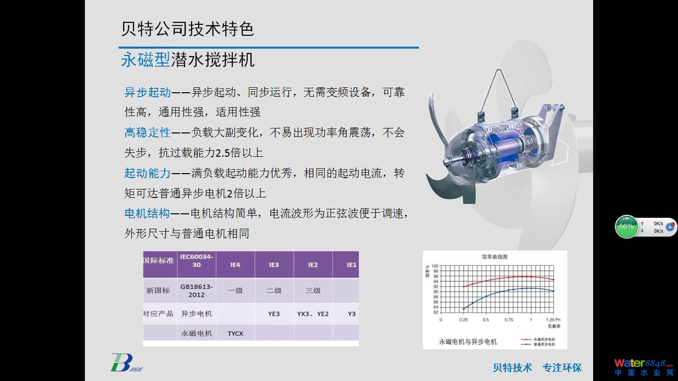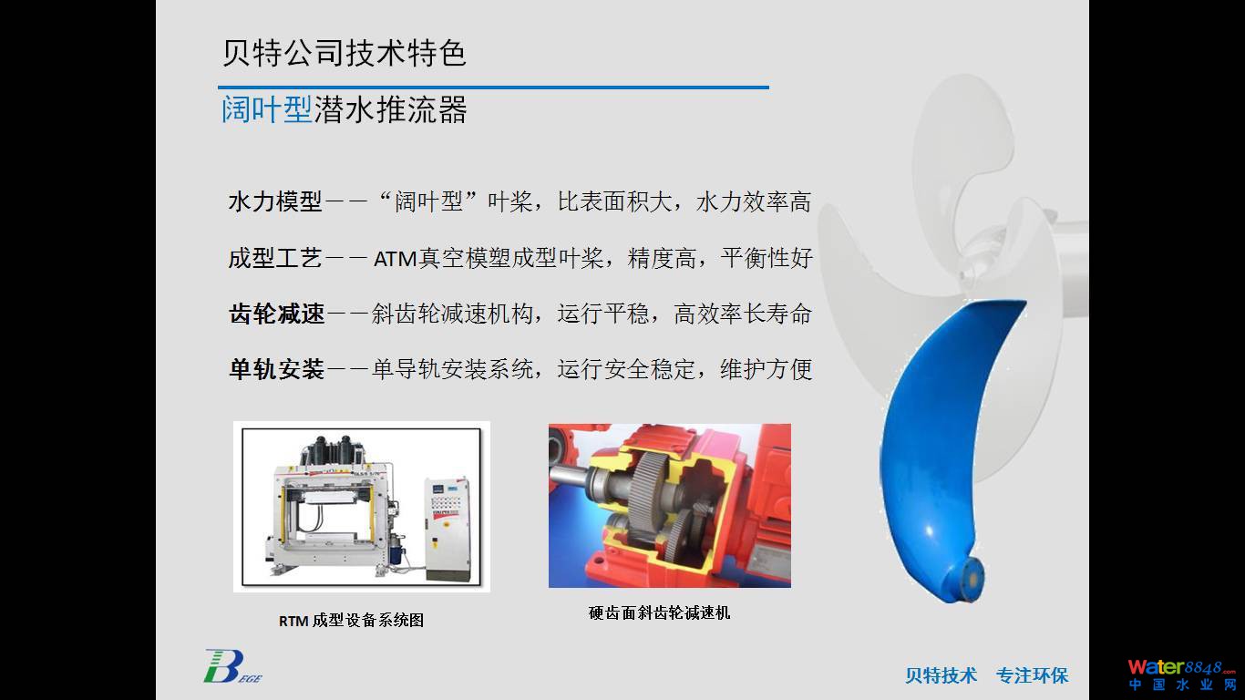 下面是我們公司的其他幾個(gè)特色產(chǎn)品,第一個(gè)是節(jié)能型潛水?dāng)嚢铏C(jī),采用了節(jié)能電機(jī)包括專用的傳動(dòng)機(jī)構(gòu),區(qū)別以前多極電機(jī)產(chǎn)品,節(jié)能效果好。第二是永磁型潛水?dāng)嚢铏C(jī),具有優(yōu)秀的啟動(dòng)和抗過(guò)載能力。第三個(gè)是普通型的推流器,我們?cè)跍p速機(jī)構(gòu)和葉槳工藝上做優(yōu)化提升。第四個(gè)是雙曲面攪拌機(jī),這個(gè)產(chǎn)品近幾年我們做污水廠升級(jí)改造用的比較多的產(chǎn)品。另外是兩個(gè)小產(chǎn)品,一個(gè)是脈動(dòng)式吸沫機(jī),可以去除生化池表面的浮渣。另一個(gè)是為厭氧反應(yīng)罐做的攪拌器。