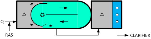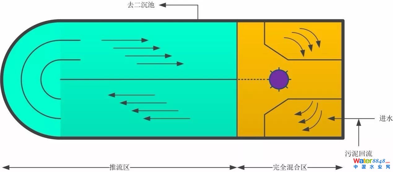 如前所述,卡魯塞爾氧化溝最明顯的特征是以立式低速表曝機取代水平軸表曝機,這樣做的工藝背景是使曝氣區(qū)基本接近完全混合反應(yīng)器的流態(tài),曝氣區(qū)下游的長渠道則基本接近推流反應(yīng)器模型的流態(tài)。因此卡魯塞爾氧化溝實際上是將兩種反應(yīng)器模型的優(yōu)勢結(jié)合在一起,既可利用長溝道進行較為徹底的生化反應(yīng),還能借助完全混合區(qū)的攪拌、緩沖能力化解水質(zhì)負荷的變化,具有較強的抗沖擊負荷能力。從現(xiàn)在的工藝觀點來看,這樣做帶來的另外一個好處就是在渠道下游形成的缺氧區(qū)還可以觸發(fā)反硝化反應(yīng)。如下圖所示。