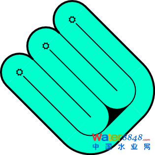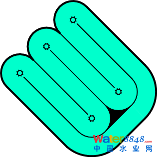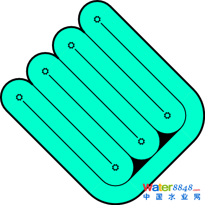 雖然卡魯塞爾氧化溝安裝表曝機的位置是有限和固定的,但池型的變化卻很豐富。需要指出,在上面的某些布置中,渠道直線段是可以彼此不一樣的,因此實際工程中的平面組合還會更多。后面將要提到的DHV Carrousel® 2000系統(tǒng)的平面布置就是采用了長度不等的渠道直線段,從而為前置缺氧池或厭氧池留出空間。記得曾在美國聽到過這樣一個笑話:一位年輕氣盛的工程師在設(shè)計卡魯塞爾氧化溝時,面對過于苛刻的設(shè)計條件和要求,發(fā)泄怨氣般地把其中一組渠道的直線段拉長,使整個平面看起來更像豎起的中指。。。這雖然只是一個笑話,但卻折射出了卡魯塞爾氧化溝在平面布置方面的靈活與多變。