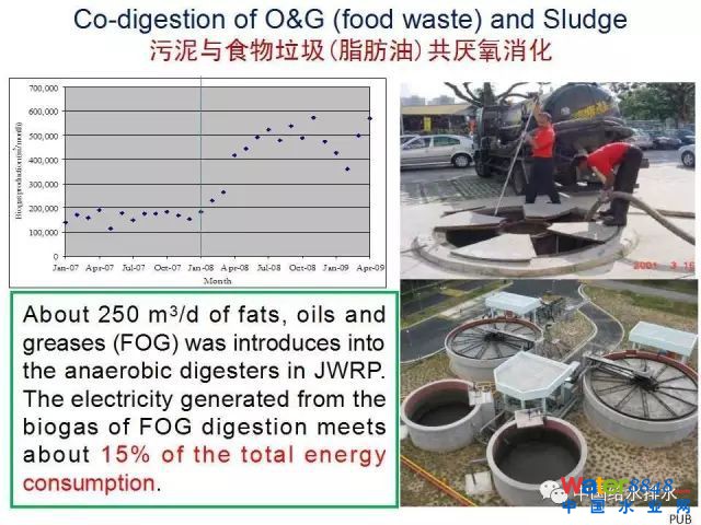 如果抓住這幾個(gè)環(huán)節(jié)以后,就可以有相當(dāng)?shù)碾娔艿幕厥,即我們稱之為能源回收的第一版。目前,在新加坡所有的污泥都進(jìn)行中溫的厭氧消化,固體揮發(fā)物的去除率是大約40%,達(dá)到國際上的公認(rèn)的水平。