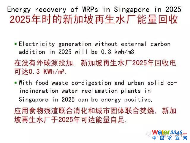 到2025年的時(shí)候,新加坡再生水廠的能源回收在沒有外加碳源的情況下可以達(dá)到0.3千瓦時(shí)每立方米污水。應(yīng)用食物殘?jiān)统鞘泄腆w廢棄物的協(xié)同焚燒,整個(gè)新加坡污水處理廠包括新生水廠可以達(dá)到能源自給,從而實(shí)現(xiàn)新加坡污水能源回收的第三版。