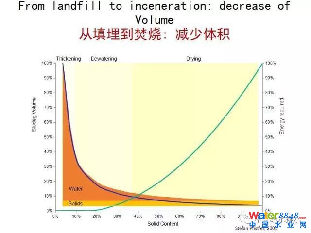 (詳見PPT)這張圖就顯示干化率、污泥體積和能源的需求關(guān)系,新加坡最早是脫水達(dá)到20%含固率以后就進(jìn)行的土地的填埋,但是沒有多久就填滿填埋場了,所以現(xiàn)在進(jìn)行焚燒處置。據(jù)我所知,在北歐許多國家焚燒是最后處置方法。當(dāng)然北京、上海最后怎么樣做?我們眼前下結(jié)論還為時(shí)尚早。