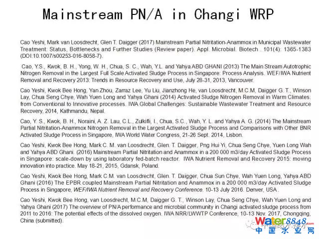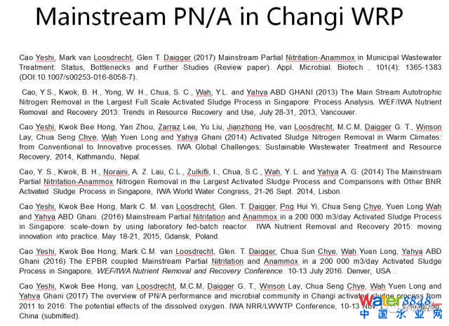 新加坡PUB前首席專家曹業(yè)始博士在前不久《中國城鎮(zhèn)污泥處理處置技術(shù)與應(yīng)用高級研討會》上的演講中向中國同行展示了樟宜再生水廠短程硝化-主流厭氧氨氧化(PN/A)的運(yùn)行效果。其實(shí),筆者注意到,這是曹博士在國內(nèi)會議這種正式公開場合向國內(nèi)同行透露的信息。