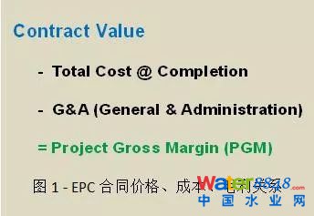 如圖1所示, EPC合同價(jià)格減去EPC項(xiàng)目完工總成本(Total Cost @ Completion),再減去應(yīng)分?jǐn)偟目偛抗芾碣M(fèi)用G&A(General &Administration ),就形成了EPC項(xiàng)目的毛利PGM(Project Gross Margin)。