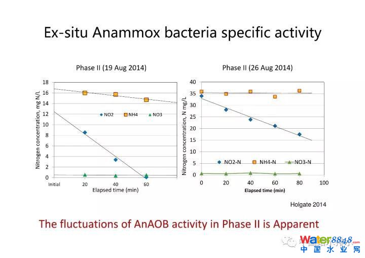 今天污水處理的根本難題是碳管理。在傳統(tǒng)的生物處理過(guò)程中,原水當(dāng)中的碳服務(wù)于兩個(gè)目的,一個(gè)營(yíng)養(yǎng)物去除,第二個(gè)送到硝化池里面產(chǎn)生沼氣。營(yíng)養(yǎng)物標(biāo)準(zhǔn)嚴(yán)格時(shí)實(shí)際沒(méi)有多少碳源可以用作能源回收的。因此,發(fā)展一種營(yíng)養(yǎng)去除不需要碳源的新過(guò)程,就提到議事日程上。氨氮厭氧氧化菌發(fā)現(xiàn)以后,引起了人們的注意。因?yàn)樗梢怨?jié)約60%的溶解氧,且不需要碳源進(jìn)行氨氮去除。這是一個(gè)根本性的變化。就是今天上午彭老師講,碳跟氮去除不用放在一起,可以分開(kāi)來(lái)處理。理論上來(lái)說(shuō)厭氧氧化全部成功可以把所有碳源拿去做能源回收。美國(guó)的切薩皮克(Chesapeake.) 地區(qū)有很嚴(yán)格排放標(biāo)準(zhǔn)。BluePlains污水處理廠每年花六百萬(wàn)美元買碳源。這是美國(guó)開(kāi)發(fā)這項(xiàng)技術(shù)的主要驅(qū)動(dòng)力。歐洲的驅(qū)動(dòng)力是增加能源回收。從國(guó)外研發(fā)來(lái)看,已經(jīng)花費(fèi)六年時(shí)間進(jìn)行改技術(shù)的開(kāi)發(fā)。而對(duì)國(guó)內(nèi)來(lái)說(shuō),我們相當(dāng)部分的污水碳氮比比較低,如果能夠應(yīng)用這項(xiàng)技術(shù),可以在低碳氮比情況下達(dá)到高標(biāo)準(zhǔn)的營(yíng)養(yǎng)去除。樟宜回用水廠實(shí)行了主流氨氮厭氧化(60萬(wàn)噸每天),工藝是典型的五點(diǎn)進(jìn)料,進(jìn)料以20%的比例進(jìn)每一個(gè)硝化池;亓鞅龋50%)進(jìn)入到第一個(gè)硝化池。硝化池和好氧池容積相同。整個(gè)水力停留時(shí)間為5.6 h。新加坡污水溫度為28 ℃-32℃。 這個(gè)圖是我們從2011年在現(xiàn)場(chǎng)取樣分析的平均值制成。有兩個(gè)典型現(xiàn)象:第一,氨氮不但好氧池里面去除,在厭氧池里也被去除;第二,每個(gè)好氧池的末端的亞硝酸氮濃度遠(yuǎn)遠(yuǎn)高于硝酸氮濃度。短程硝化很明顯。部分硝化率為72%,相當(dāng)于10個(gè)氨氮進(jìn)入好氧去,有7個(gè)氨氮被氧化掉。而這7個(gè)被氧化掉的氨氮中70% 氧化成了亞硝酸,剩余的變成了硝酸根。亞硝酸氧化菌的活性被嚴(yán)重抑制。