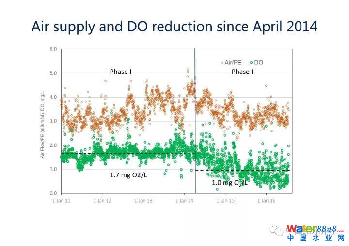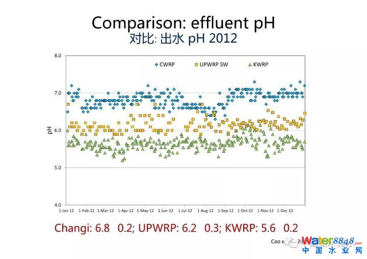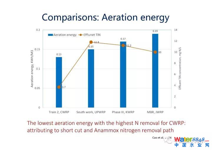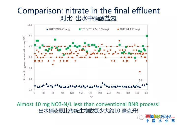 對(duì)比曝氣能耗,樟宜處理每立方水電耗為0.13 kW·h,能耗比新加坡其它幾個(gè)污水廠低10%-30%。 而樟宜污水廠的出水TN遠(yuǎn)低于新加坡其它幾個(gè)污水廠,這充分說(shuō)明樟宜污水廠的脫氮能耗最低。我在這里沒(méi)有談脫磷,我們也在厭氧區(qū)發(fā)現(xiàn)反硝化脫磷現(xiàn)象,今天時(shí)間有限就不講了。