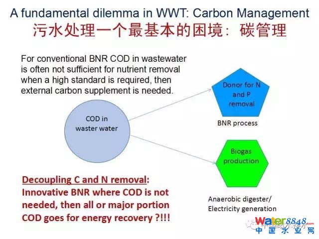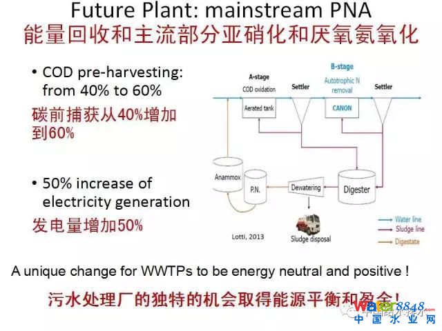 到2025年新加坡三個(gè)水廠建成的時(shí)候,能量回收的情況如何呢?污水處理最大的困境就是碳的管理,本身讓碳源要用來(lái)去除營(yíng)養(yǎng)物又產(chǎn)能源的時(shí)候,是很難兩全其美的,這就是我們現(xiàn)在要談主流厭氧氨氧化的問(wèn)題。未來(lái)處理廠的概念,如果這概念廠能實(shí)現(xiàn),今后的處理廠可可以把盡量多的碳拿下來(lái)送到厭氧消化里面去產(chǎn)生能源。但是條件是什么呢?后面的營(yíng)養(yǎng)物的去除不需要碳源,或者是需要的很少,這就提供了一種能源平衡和剩余的可能性。比如說(shuō)我們先的現(xiàn)在的初沉池碳去除是40%,你就可以增長(zhǎng)到60%,相當(dāng)于50%能源的增加。