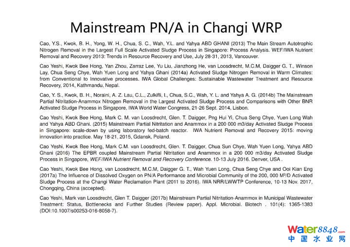 (詳見(jiàn)PPT)目前新加坡樟宜再生水廠,20萬(wàn)噸的主流厭氧消化過(guò)程已經(jīng)報(bào)告了,是世界上最大的部分短程氨氧化和氨厭氧化過(guò)程,并且在2014年,我們跟美國(guó)的兩家水務(wù)系統(tǒng)和Strass廢水處理廠一起贏得了國(guó)際水協(xié)的發(fā)明大獎(jiǎng)。