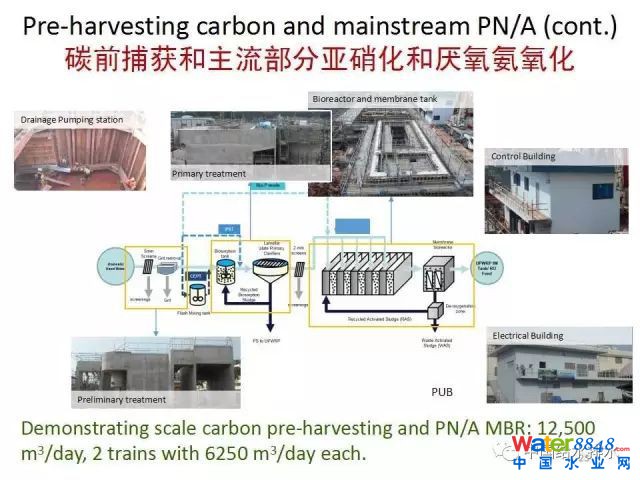 所以從2011年以來(lái),新加坡PUB做了一系列的研發(fā)項(xiàng)目,三個(gè)中試的項(xiàng)目就著眼于回答這些問(wèn)題。而最新的就是日處理1.2萬(wàn)噸稱之為示范廠的項(xiàng)目,是模擬今后的第二階段的污水處理,看看主流厭氧氨氧化能不能實(shí)現(xiàn)。