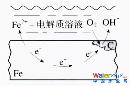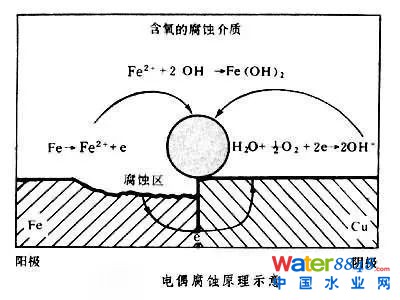 金屬腐蝕過程中,電流在陽極部位和陰極部位間流動,這說明陽極部位和陰極部位間有電位差。如果水中不含氧,陽極腐蝕反應(yīng)的電子在陰極發(fā)生以下反應(yīng):