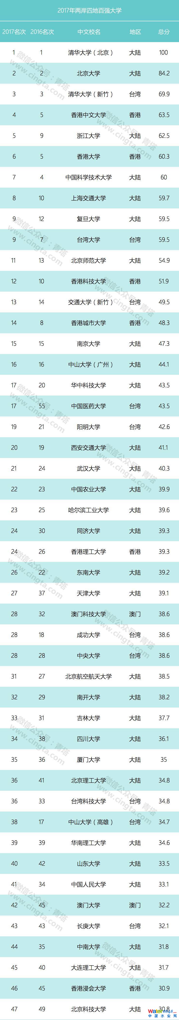 2017年中國兩岸四地大學(xué)百強:清華、北大領(lǐng)跑