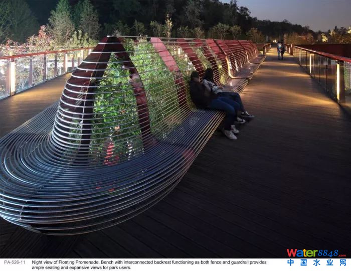 公園的中心是點題的18000平米的人工湖,這片湖面是原有湖面保留下來的,到達這里之前有一段4米高的圍墻,后來為了保證流線直接,這堵墻被推到了。為了吸引人們,設(shè)置了觀景臺和甲板。