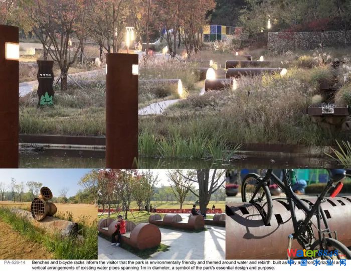 公園入口是深褐色的柱廊區(qū)域,有標示示意:“西首爾湖公園”。周邊有長凳和自行車停車位。引入眼簾的縱橫結(jié)構(gòu)是直徑1m寬的老排水管,這是公園的象征之一。