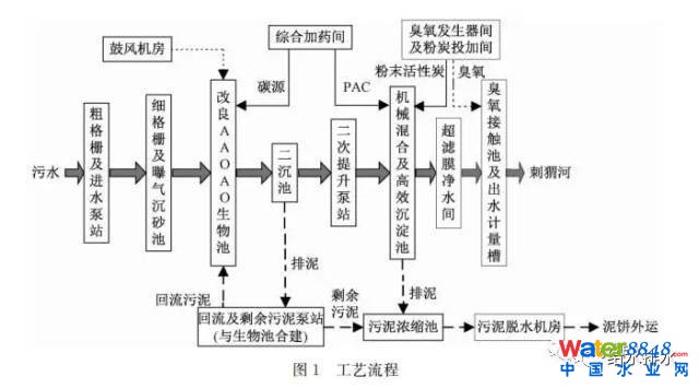 (3)深度處理工藝采用混凝+高密度沉淀池+超濾膜+臭氧工藝。該工藝集化學(xué)除磷、高效去除殘余SS和COD、脫色、消毒等多種功能于一體。