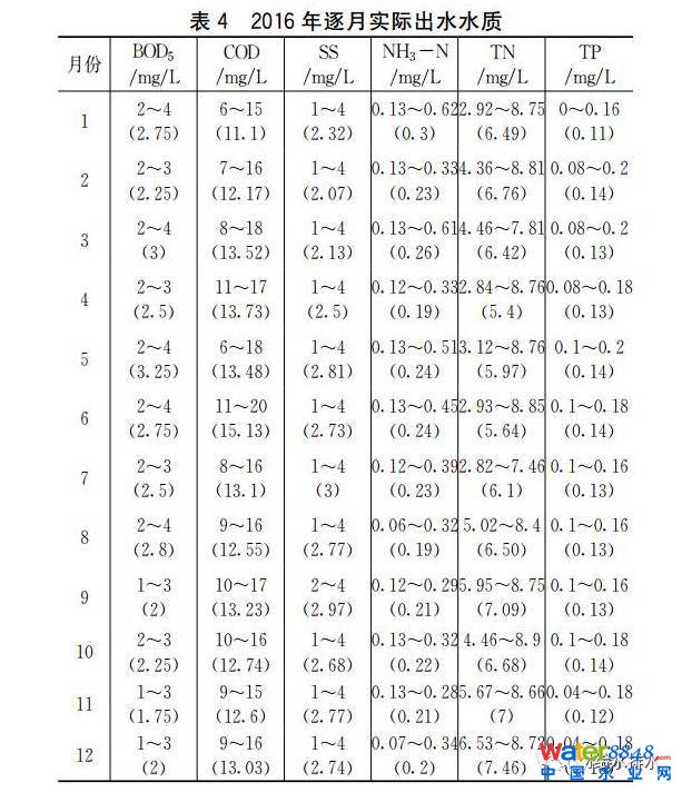 工程2016年逐月實(shí)際出水水質(zhì)見(jiàn)表4;對(duì)2016年逐日實(shí)際出水水質(zhì)進(jìn)行數(shù)理統(tǒng)計(jì)分析,結(jié)果見(jiàn)表5。