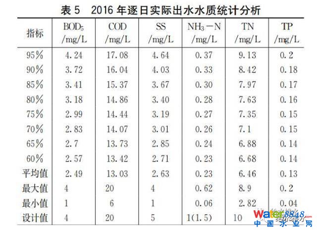 工程2016年逐月實際出水水質(zhì)見表4;對2016年逐日實際出水水質(zhì)進行數(shù)理統(tǒng)計分析,結(jié)果見表5。