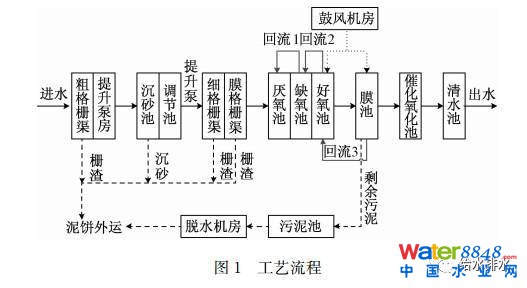 圖2推入排出式膜池回流(5)由于對出水水質(zhì)要求很高,尤其是出水COD要求達到20mg/L以下,因此深度處理采用臭氧催化氧化工藝,傳統(tǒng)方式去除COD需投加的臭氧量較大,投加比例O3/COD為3,而采用臭氧催化氧化工藝,投加比例O3/COD可降為1.5~2,大大減少臭氧的投加量。