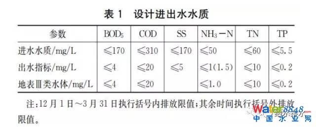 本工程為北京某鎮(zhèn)級新建污水處理廠,設(shè)計規(guī)模為3000m3/d。設(shè)計進水水質(zhì)參照臨近區(qū)域同等市政污水處理廠,設(shè)計出水水質(zhì)要求同時達到《城市污水再生利用 城市雜用水水質(zhì)》(GB 18920-2002)及北京市《城鎮(zhèn)污水處理廠水污染物排放標準》(DB 11/890-2012)A標準。綜合上述標準,本工程設(shè)計進出水水質(zhì)要求見表1。