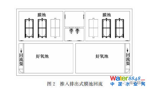 (4)膜池回流采用推入排出式(見圖2),傳統(tǒng)膜池為方便回流,配水渠需繞到膜池另一側(cè),配水渠和回流渠水力停留時間較長,土建量也較大,采用推入排出式可節(jié)省土建量,方便膜池的回流。