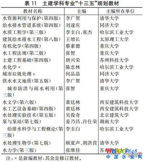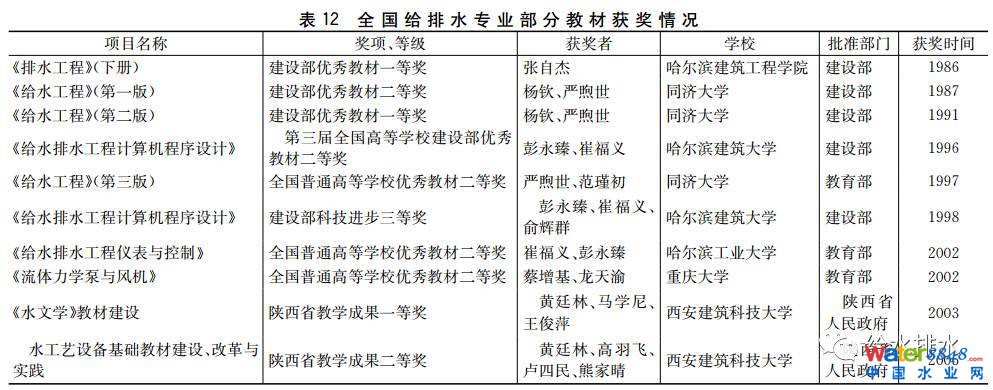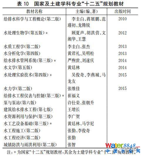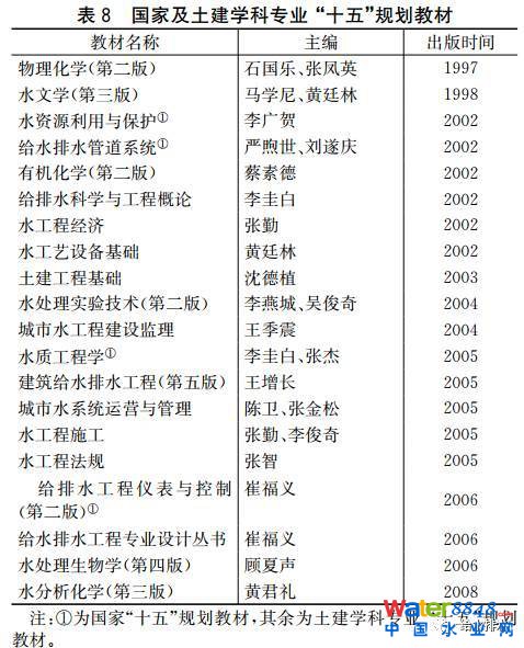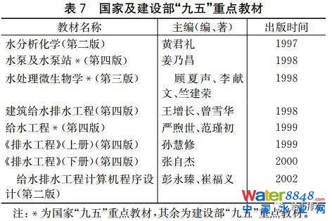 “九五”期間,給排水專業(yè)有3部教材被評(píng)為國(guó)家“九五”重點(diǎn)教材、5部教材被評(píng)為建設(shè)部“九五”重點(diǎn)教材(建設(shè)部建教[1996]591號(hào)文件),見表7。