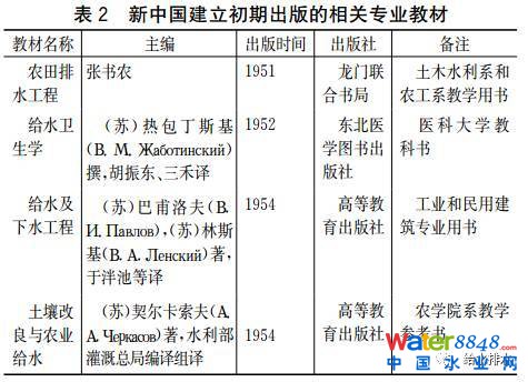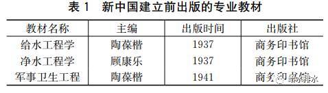 新中國(guó)建立前出版了少量的衛(wèi)生工程學(xué)科的專業(yè)教材(見表1)。在1952年專業(yè)建立之前及專業(yè)創(chuàng)辦初期,有一些相關(guān)專業(yè)或從蘇聯(lián)教材翻譯的其他專業(yè)教材(見表2)。