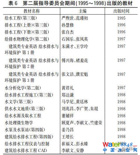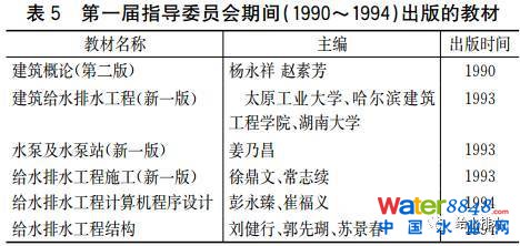 1989年,教材編審委員會(huì)更名為“全國(guó)高等學(xué)校給水排水工程學(xué)科專業(yè)指導(dǎo)委員會(huì)”。第一屆指導(dǎo)委員會(huì)主要工作仍是教材建設(shè),期間組織出版的教材有6部,見表5。
