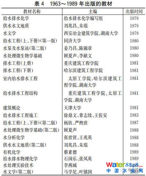 1963年建筑工程部教育司設(shè)立了給排水專業(yè)教材編審委員會(huì),負(fù)責(zé)組織全國(guó)給排水專業(yè)教材選題、編寫和審查,在“文革”期間停止了活動(dòng)。1978年教材編寫工作恢復(fù)。1981年設(shè)立城鄉(xiāng)建設(shè)環(huán)境保護(hù)部“高等工業(yè)學(xué)校給水排水及環(huán)境工程類”專業(yè)教材編審委員會(huì),組織編寫了一系列專業(yè)課和專業(yè)基礎(chǔ)課的統(tǒng)編教材。1963~1989年間共出版教材20部(見表4)。(本文中表4~表11所列教材皆由中國(guó)建筑工業(yè)出版社出版)
