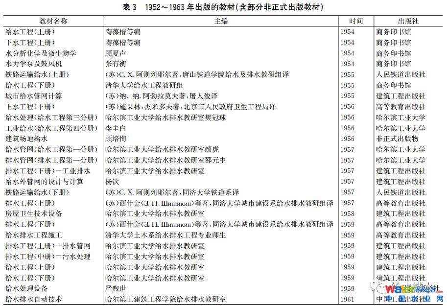1952年后,為了解決給排水專業(yè)教材急需的問(wèn)題,一些高校和政府主管部門組織翻譯出版了一批蘇聯(lián)教材,同時(shí)也編著出版了一批教材,為給排水專業(yè)的教學(xué)提供了基礎(chǔ)(見表3)。