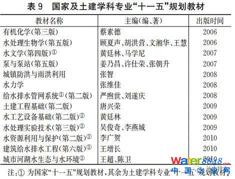 本屆指導(dǎo)委員會(huì)組織編寫了部分主干課程系列推薦教材,共規(guī)劃立項(xiàng)16部推薦教材,其中13部教材被評(píng)為普通高等教育土建學(xué)科專業(yè)“十一五”規(guī)劃教材(其中7部同時(shí)為普通高等教育 “十一五”國(guó)家級(jí)規(guī)劃教材)(建人函[2007]83號(hào))。這批教材充分吸收給排水專業(yè)的最新科技成果,并體現(xiàn)出本專業(yè)的工程特色(見表9)。
