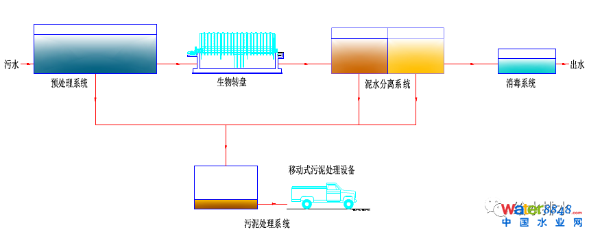 鎮(zhèn)級生活污水首先進(jìn)入預(yù)處理系統(tǒng),攔截大的雜物、沉淀懸浮物和調(diào)節(jié)水量。再進(jìn)入高效生物轉(zhuǎn)盤單元,生物轉(zhuǎn)盤以一定的線速度不停地轉(zhuǎn)動,生物膜交替的與污水和空氣接觸,變成一個連續(xù)的吸氧、吸附、氧化分解過程,從而使污水得到凈化。與此同時轉(zhuǎn)盤上的生物膜也同樣經(jīng)歷掛膜、生長、增厚和老化脫落的過程,脫落的生物膜可進(jìn)入泥水分離系統(tǒng)。泥水分離后上清液經(jīng)紫外消毒后達(dá)標(biāo)排放。污泥采用移動式污泥處理裝備,可同時解決多個廠(站)的污泥處理問題。