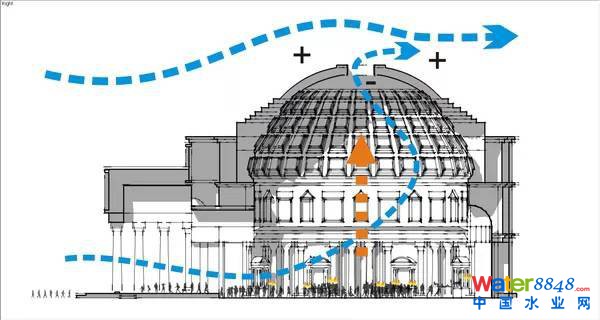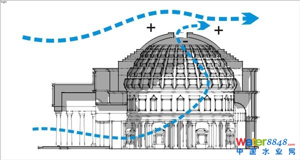 再把建筑材料尺度和風一起考慮進來,很有可能就是這樣的情景:本就不大的毛毛細雨被風卷裹著拂過穹頂洞口,剛想落入穹頂,就被室內(nèi)上升的熱氣流吹的不知道東西,縱然水汽落入到室內(nèi),在熱空氣的紊流中這些水汽還沒來得及落在人的身上就被曝露的穹頂內(nèi)壁吸附了去又或者隨著風壓又被帶出了屋頂。