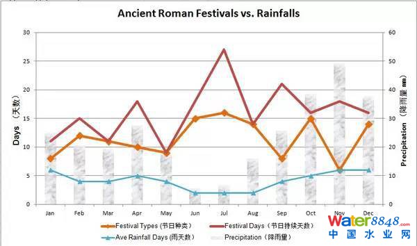 如果把羅馬的降雨量(借用現(xiàn)在的數(shù)據(jù))和古羅馬有記錄的節(jié)日種類和持續(xù)時間(Roman Festivals)做一個比對的話,就會類似下面的圖表: