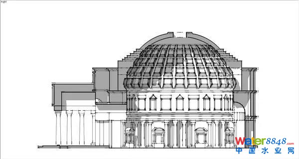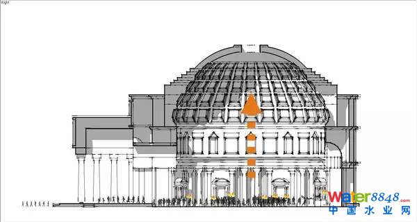 因為比例的關系,在這個高寬可達58米,穹頂直徑43.3米的建筑里,頂部的8.9米直徑的洞口在視覺感受上就顯得不是特別大了。如果腦補下雨水從這個空洞落入室內(nèi)的畫面,大概會是水滴穿過隘口一下進入到寬廣和高深的室內(nèi),在這個內(nèi)部空間的周圍是布滿藻井的穹頂內(nèi)表面。如此,雨水進入的是一個內(nèi)環(huán)境,而這個內(nèi)環(huán)境的強大,很有可能足以影響雨水的運動。
