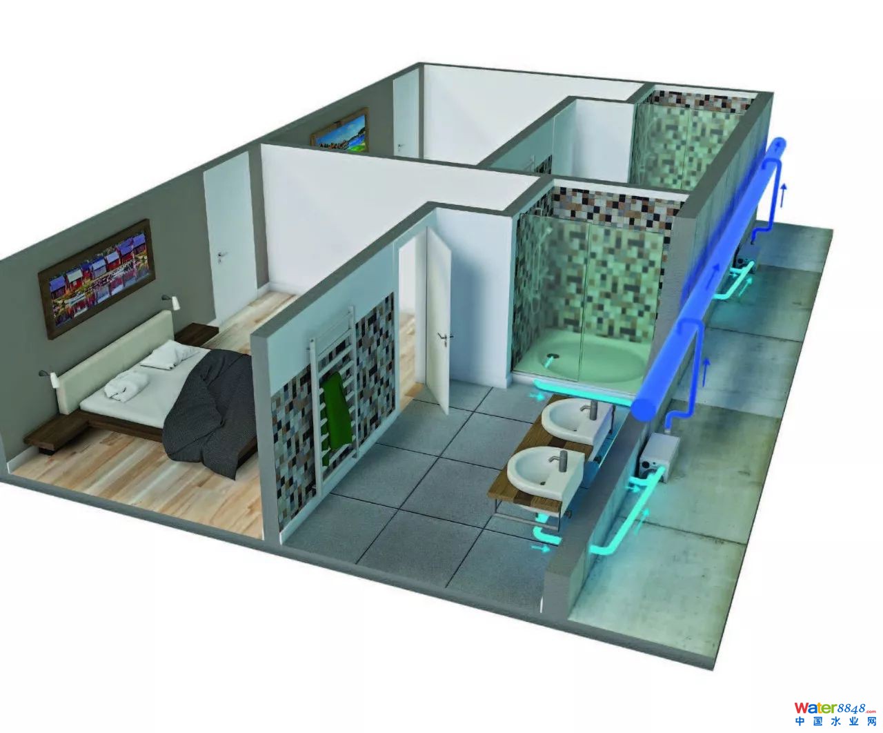 利用可以讓房間調(diào)整發(fā)生翻天覆地的變化,例如在床腳處用升利達(dá)泵增加一個浴缸,直接升級成豪華客房 ▼