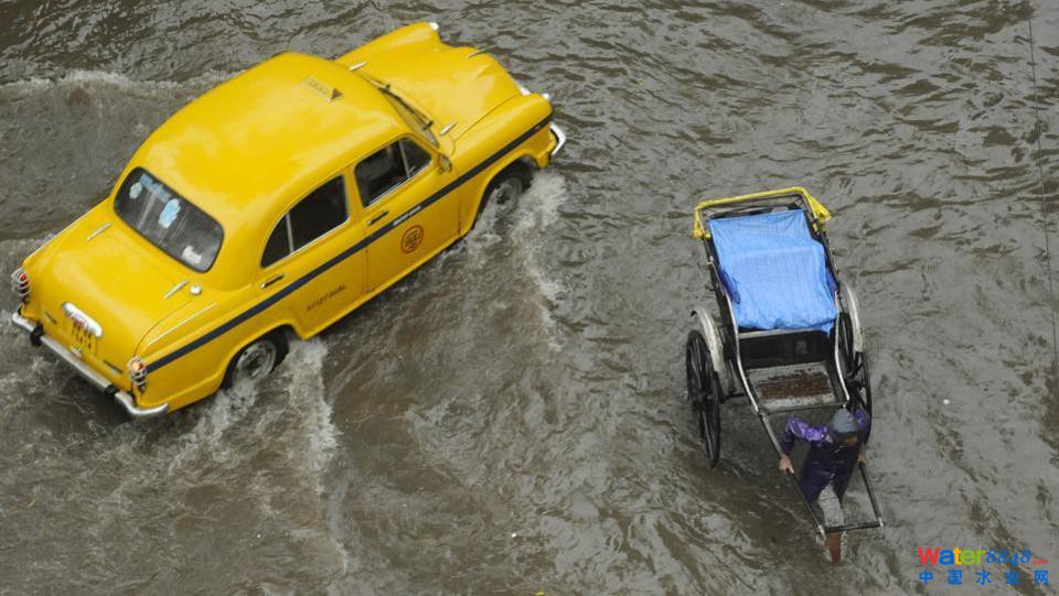 出租車(chē):十月份的一個(gè)雨天,加爾各答的黃色出租車(chē)與人力車(chē)在水中行走。它們形成了鮮明的對(duì)比。