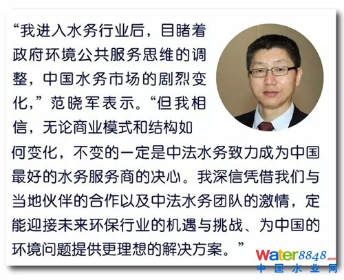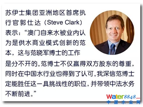 范博士在澳門自來水工作的16年間,不僅成功與澳門政府續(xù)簽20年的專營合同,同時他還致力于改革創(chuàng)新、積極完善公司的管理和服務,使其成為中國水行業(yè)的標桿和典范,也正是因為澳門自來水項目的成功,使其股東蘇伊士及兄弟公司中法水務的品牌形象在國內得以快速提升,這對后期中法水務拓展國內水務市場具有非凡意義。