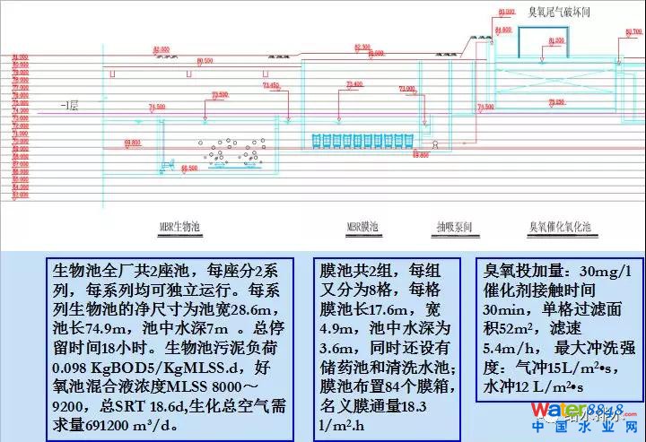 生物池部分,整個水利提留時間是18小時,為多級AO的形式。后面MBR的膜系統(tǒng),膜通量是18.3升/平方米/小時的膜通量。高級氧化接觸池臭氧投加最高按30毫克做的,空場接觸時間是30分鐘。濾速5米多一點。