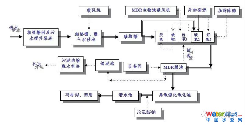 按照對各種主要出水指標(biāo)的工藝方案的分析,結(jié)合實際工程的特點,按照現(xiàn)在社會影響普遍能夠接受的方式,設(shè)計了地下處理廠,采用MBR工藝,此工藝是多級AO+MBR+臭氧+高級氧化工藝流程。