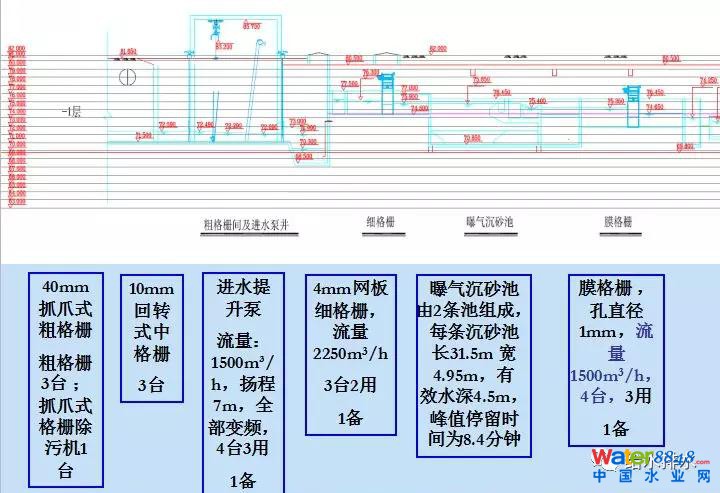 下面通過一個流程圖對參數(shù)做一個概述,抓爪式粗格柵40mm,有3臺,回轉(zhuǎn)式中格柵3臺,進水提升泵是按照系數(shù)設(shè)計,地下部分開始的細格柵是4毫米的,細格柵后面是曝氣沉砂池,它的峰值停留時間能夠在8分鐘以上。沉砂池后面是一毫米的孔狀膜格柵。