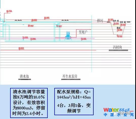 清水池按照8萬噸的10%做的設(shè)計,最大停留時間是2.4小時,后面是配水泵,最終水可以排到村溝。