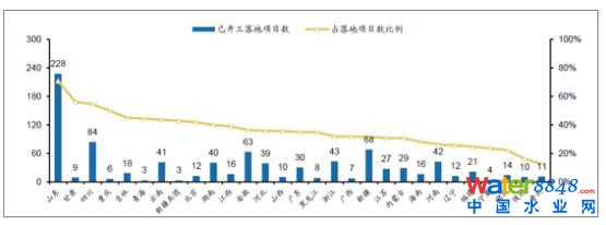 2017年9月管理庫開工項目數(shù)各省分布及占落地項目數(shù)比例(單位:個)