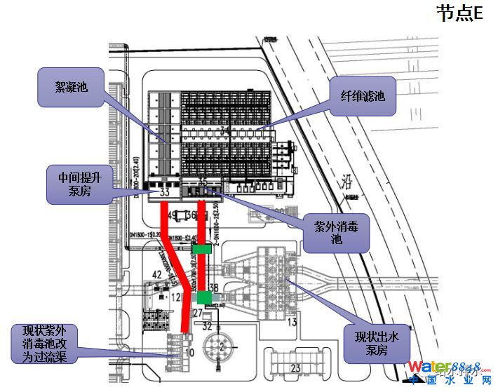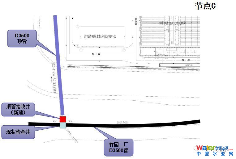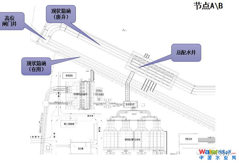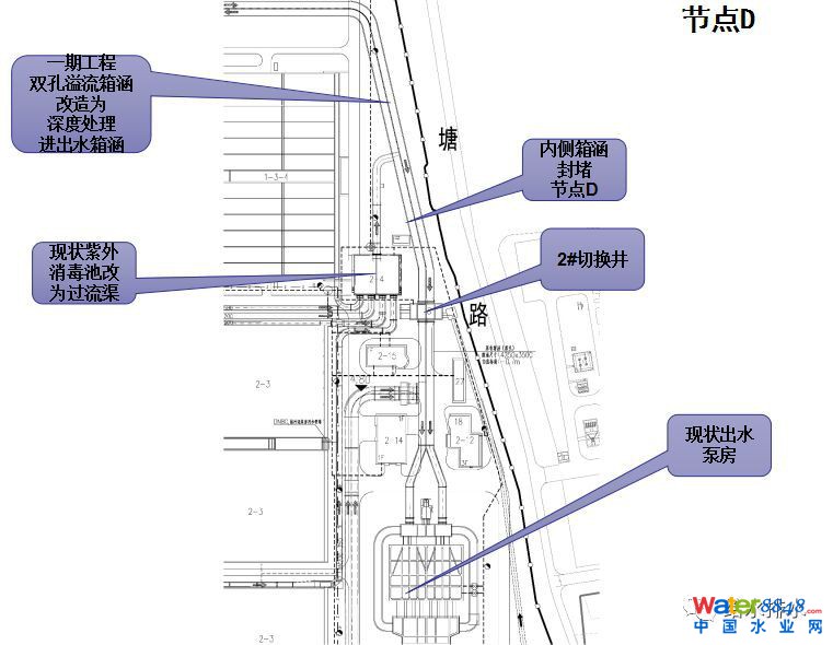新建配水井要滿足80萬噸的分流和減的量以及雨季的量,第二是老箱涵和新箱涵怎么銜接。整個(gè)工程的關(guān)鍵節(jié)點(diǎn)就是節(jié)點(diǎn)B。節(jié)點(diǎn)C是已經(jīng)建成的50萬噸的管道分流,節(jié)點(diǎn)D是改造管道至深度處理。整個(gè)量都很大,施工過程中可以看到占地也是非常節(jié)約的。