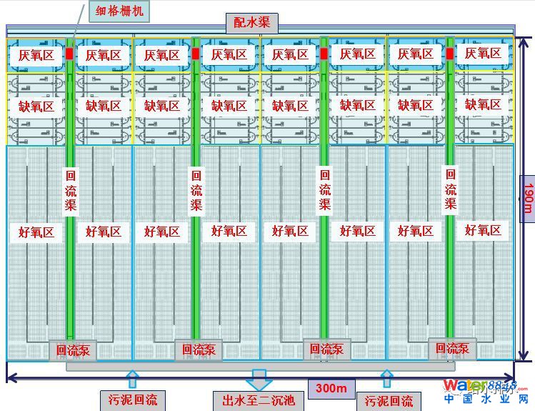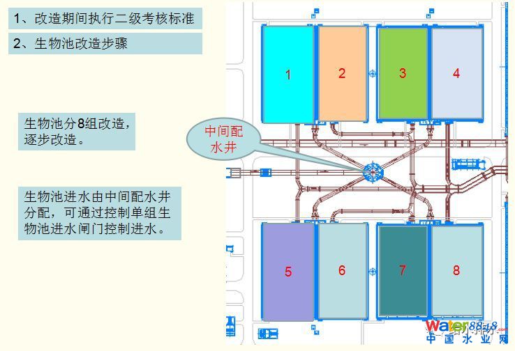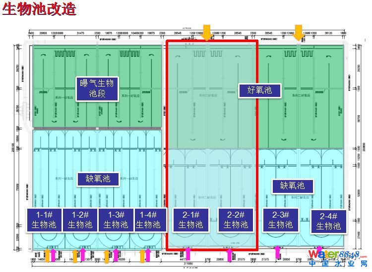 我們在生物池里面主要是這幾塊,第一塊原來的生物水池170萬噸分兩個(gè)系列,80萬噸系列和90萬噸系列,80萬噸是20萬噸一組,中間的隔墻沒有考慮單倉檢修,這次改造的時(shí)候是40萬噸/組檢修加內(nèi)回流,這次不光要改造缺氧好氧分區(qū)還要改造內(nèi)回流。