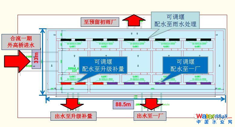 我們在切換過程中怎么銜接原來的管道,先新建完再切換回來,在這個(gè)過程中提出了怎么在運(yùn)行中建設(shè)這個(gè)項(xiàng)目。如圖是第一個(gè)井80萬噸的,可以看到整個(gè)長88.5米,寬33米,加上圍護(hù)接近100米,這個(gè)廠要同時(shí)實(shí)現(xiàn)雨季旱季80萬噸的分流,170萬噸的減量,以后還要做雨水處理,因?yàn)樯虾I钏碚趯?shí)施,深隧的水要通過這個(gè)井分到雨水處理廠,這是上海未來幾年重要的項(xiàng)目之一,所以這個(gè)井就要解決好幾個(gè)功能,而且這么大的流量還沒有辦法做簡單的控制,所以我們也經(jīng)過長遠(yuǎn)考慮,也是經(jīng)過水利模型模擬了幾次。