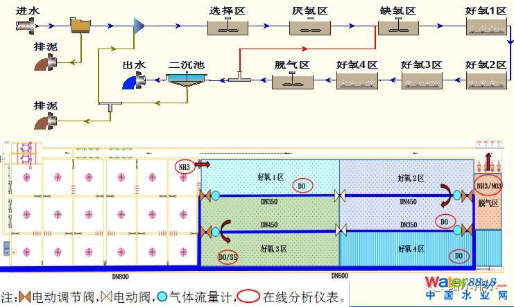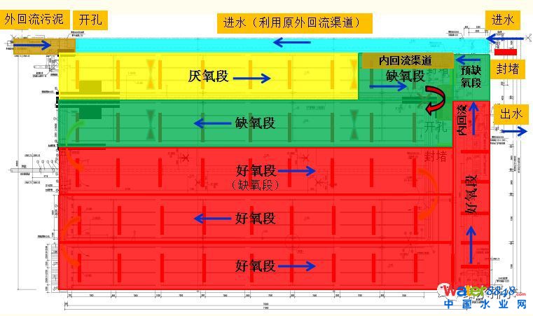 這個(gè)廠里面原來的工藝采用的是二級標(biāo)準(zhǔn)工藝,現(xiàn)在要用老池,盡量減少土建,利用原有的曝氣設(shè)施攪動最小,所以進(jìn)行了厭氧、缺氧的改造加內(nèi)回流設(shè)施,整個(gè)改造量從施工量上也是比較少的,這是下了很大的功夫考慮這一塊。我們以后會面臨很多這樣老廠的提標(biāo)改造工藝升級,在原有土建上怎么進(jìn)行提標(biāo)改造,供大家學(xué)習(xí)借鑒。