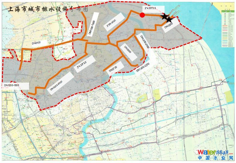 上海市2017年1-7月份統(tǒng)計(jì)污水量為700萬立方米/天,每萬噸污泥1.32噸干基。整個(gè)上海50多座廠,最近正在新建幾座,建成后水量應(yīng)該突破700萬立方米/天。竹園廠的系統(tǒng)占了1/3的區(qū),經(jīng)過多年建設(shè)全部匯集到江邊,現(xiàn)在已經(jīng)建好兩座廠,如下圖是整個(gè)廠的服務(wù)面積,服務(wù)上海1/3的水量。