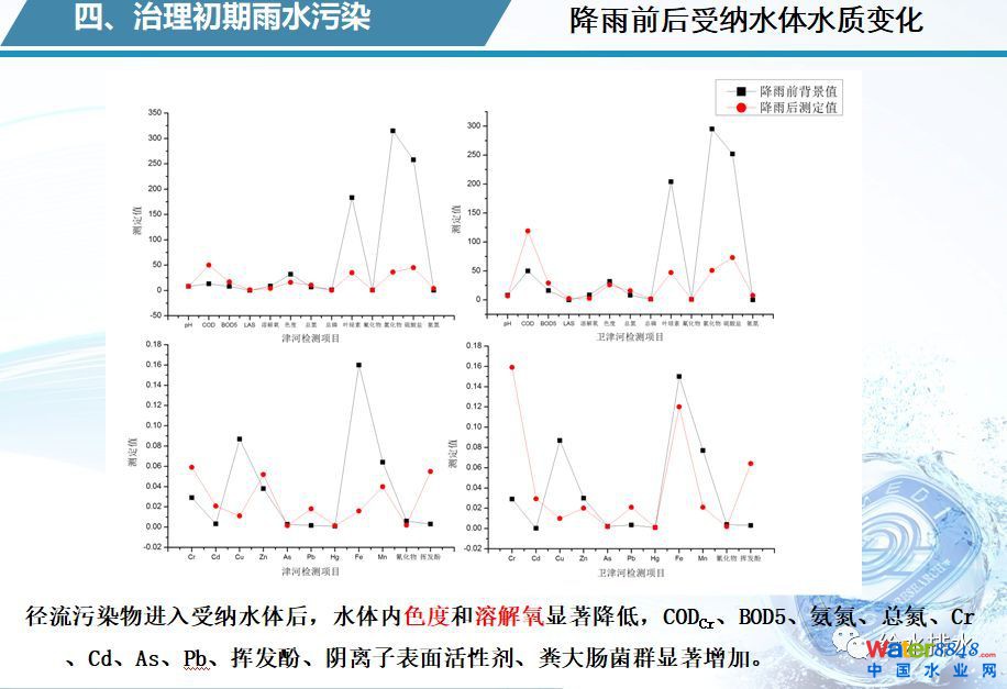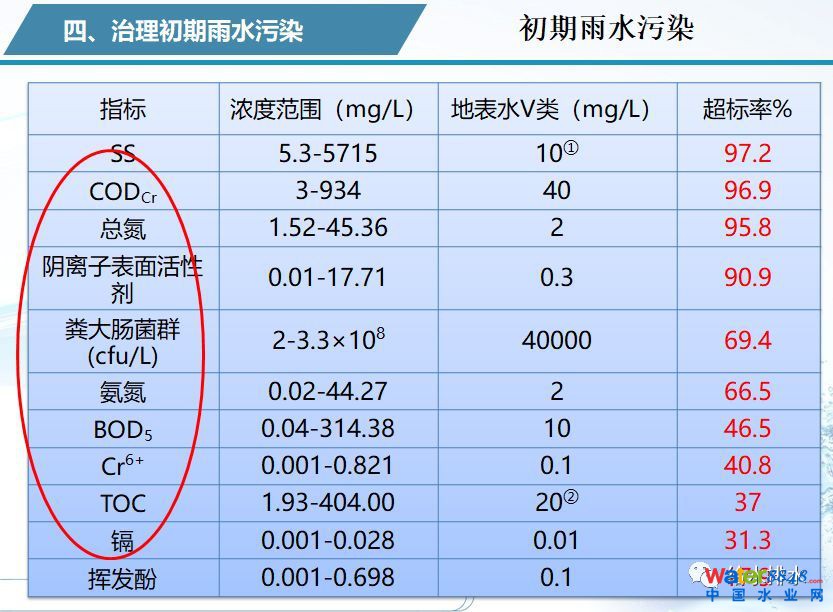 再一個初期雨水的污染也很嚴重,應該高度重視。這是我們團隊檢測的天津市初期雨水污染物濃度。很多時候初期雨水污染物濃度比污水處理廠進水的濃度都要高。